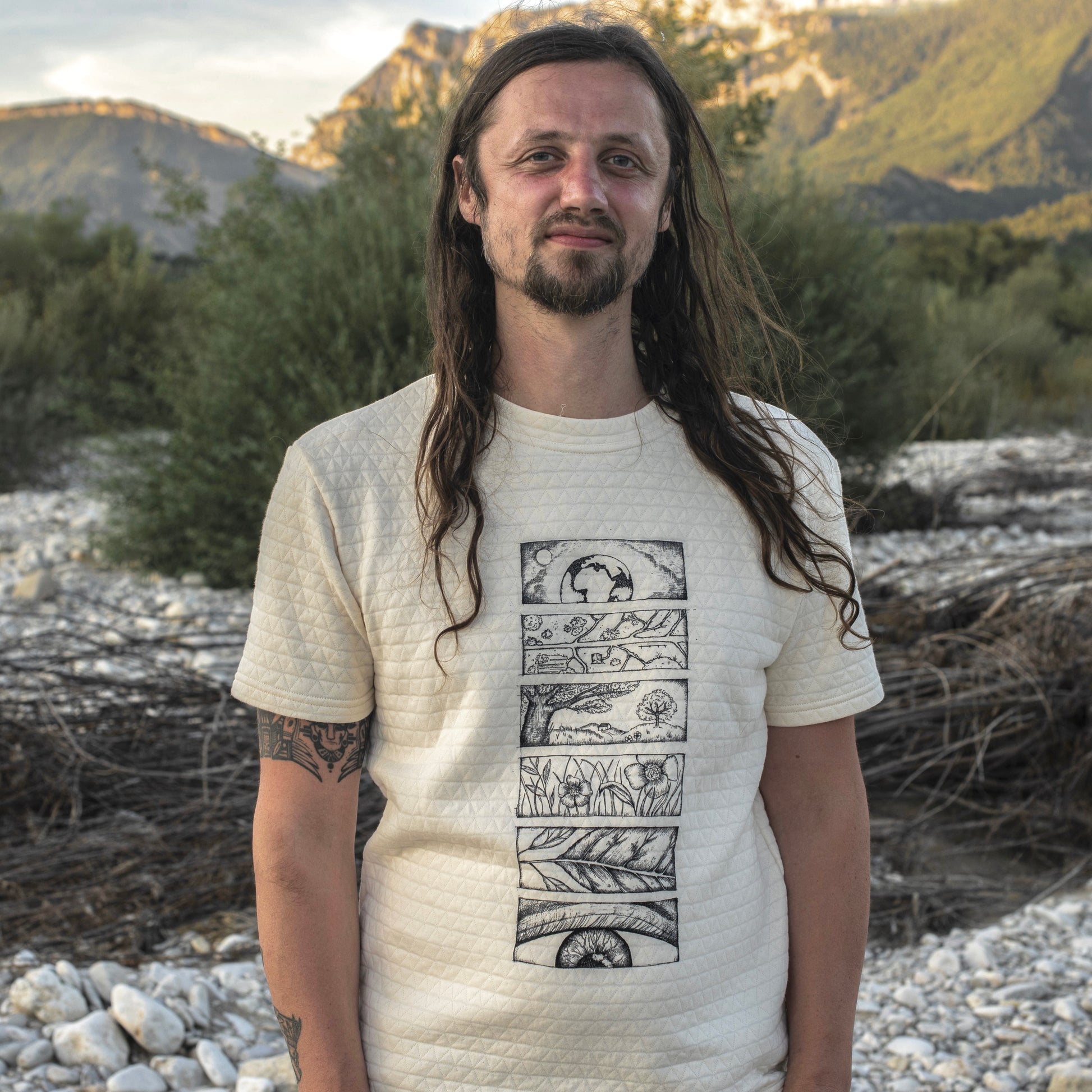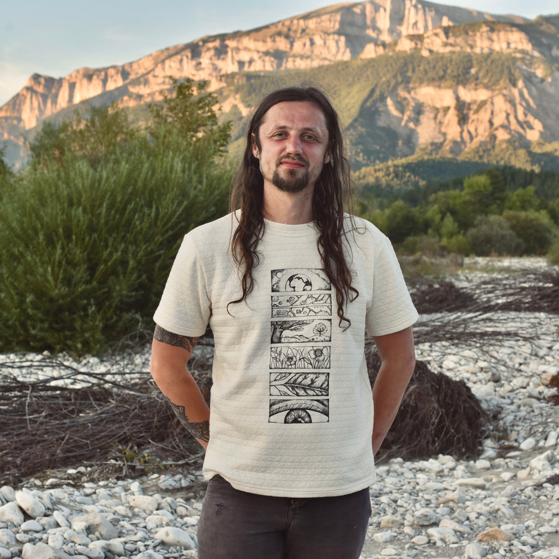 T-shirt matelassé épais en coton biologique, écru, coupe longue. Modèle unisexe.