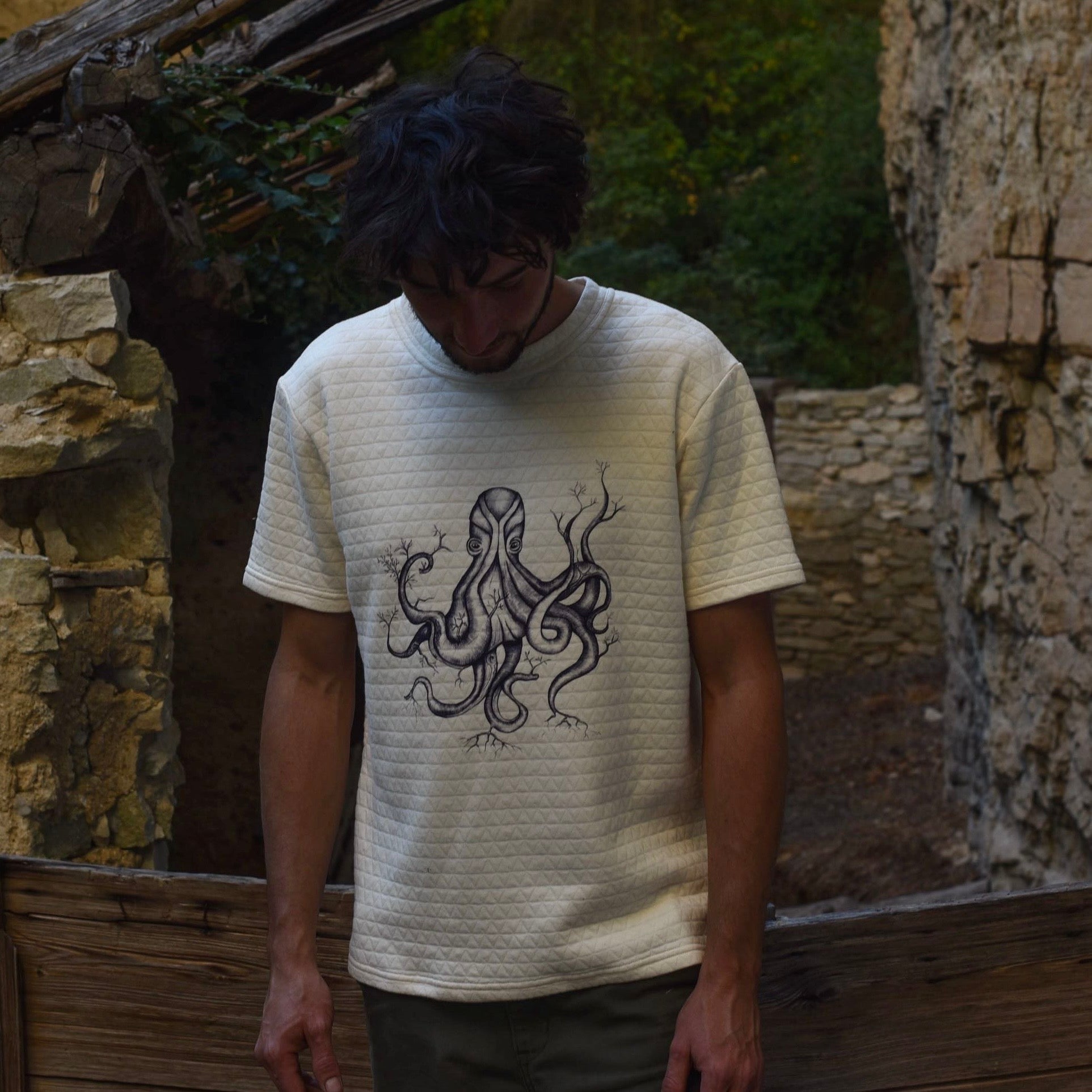 🧵 Tissu & coupe : Matelassé épais écru — coupe longue, unisexe